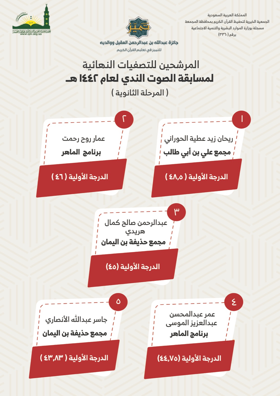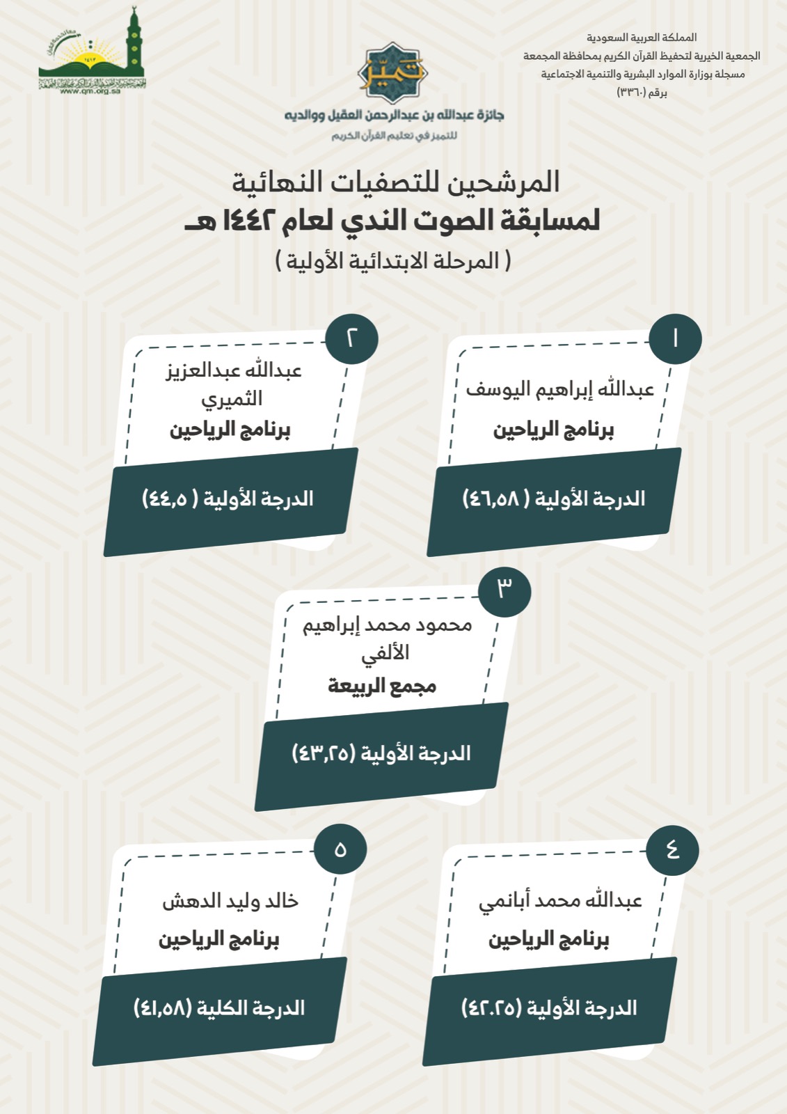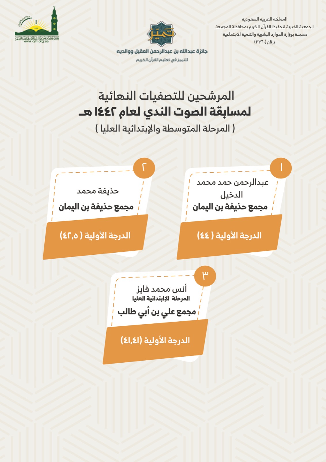 أعلنت لجنة جائزة الشيخ عبدالله بن عبدالرحمن العقيل ووالديه للتميز في تعليم القران الكريم عن أسماء المتأهلين من التصفيات الأولية إلى التصفيات النهائية لمسابقة الصوت الندي لعام ١٤٤٢ه. كما أعلنت اللجنة عن إقامة التصفيات النهائية للمسابقة يوم الثلاثاء الموافق ١٤٤٢/٠٧/١١ هـ في قاعة الجمعية ، كما ندعوا المشاركين إلى الإلتزام بالإجراءات الإحترازية وتحميل تطبيق توكلنا ، متمنين للمشاركين التوفيق والسداد.