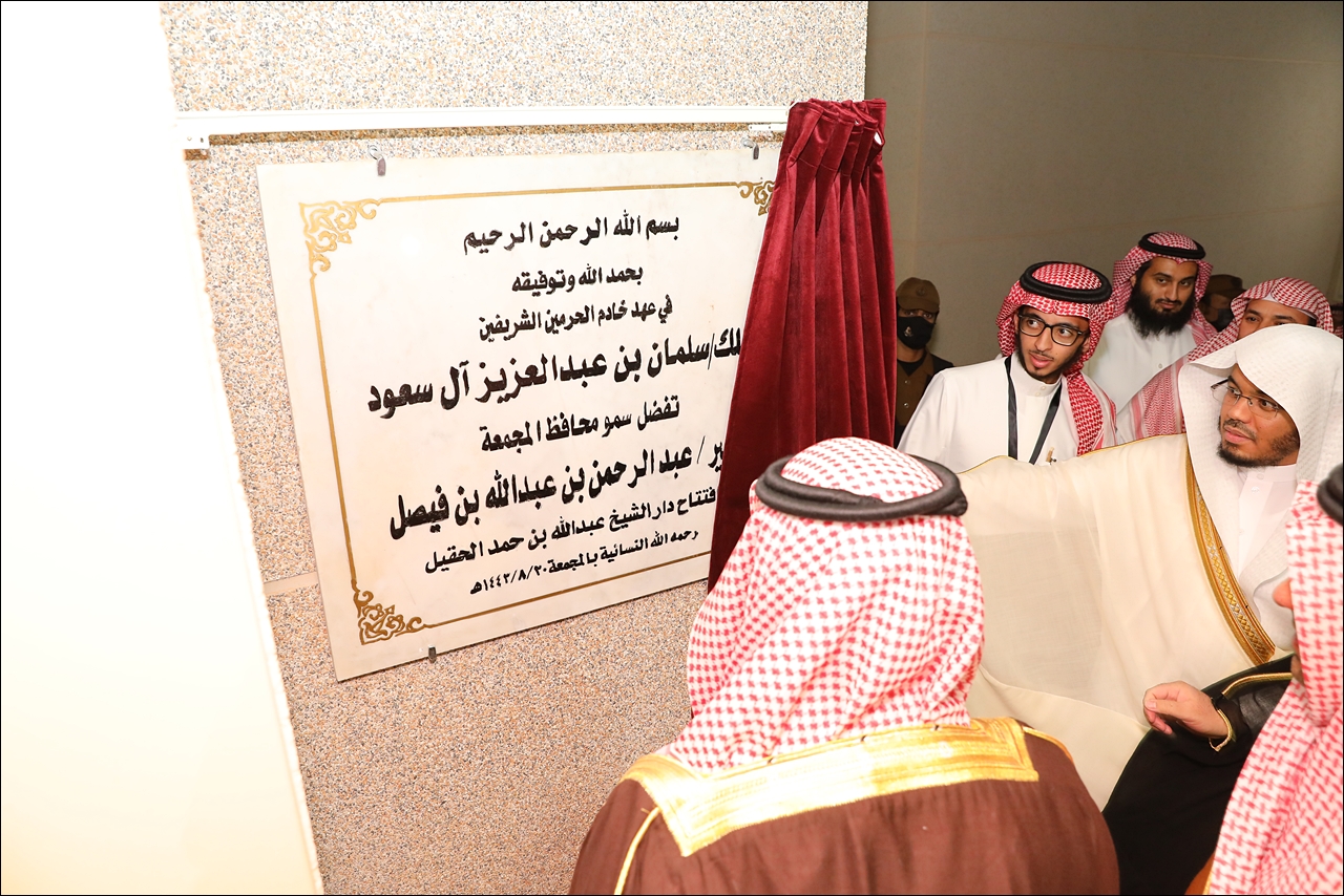 الحمد لله الذي بنعمته تتم الصالحات ، بحضور سمو محافظ المجمعة الأمير عبدالرحمن بن عبدالله بن فيصل ومعالى وزير الشؤون البلدية والقروية والإسكان الأستاذ : ماجد بن عبدالله الحقيل وفضيلة الشيخ الدكتور ياسر بن راشد الدوسري إمام الحرم المكي الشريف ، افتتحت الجمعية مغرب يوم الأربعاء ١٤٤٣/٠٨/٢٠ هـ دار الشيخ عبدالله الحقيل رحمه الله بتبرع كريم من أبناء الشيخ رحمه الله بحي المستقبل بالمجمعة ، ودار أم المؤمنين أم سلمة رضي الله عنها بحي البصيرة بتبرع كريم من فاعلة خير ، فجزاهم الله عنا كل خير وأخلف عليهم بالأجر والمثوبة.