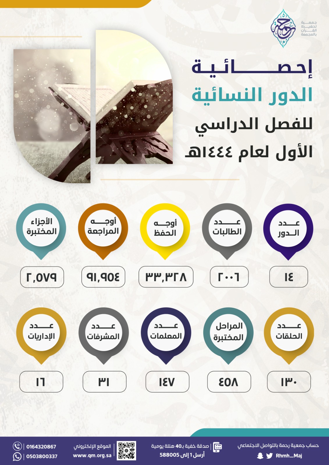 مع نهاية الفصل الدراسي الأول بلغ مجموع عدد الأوجه المحفوظة والمراجعة في الدور النسائية (١٢٥،٢٨٢) ألف وجه من كتاب الله، وإليكم تفاصيل إنجازاتهم: