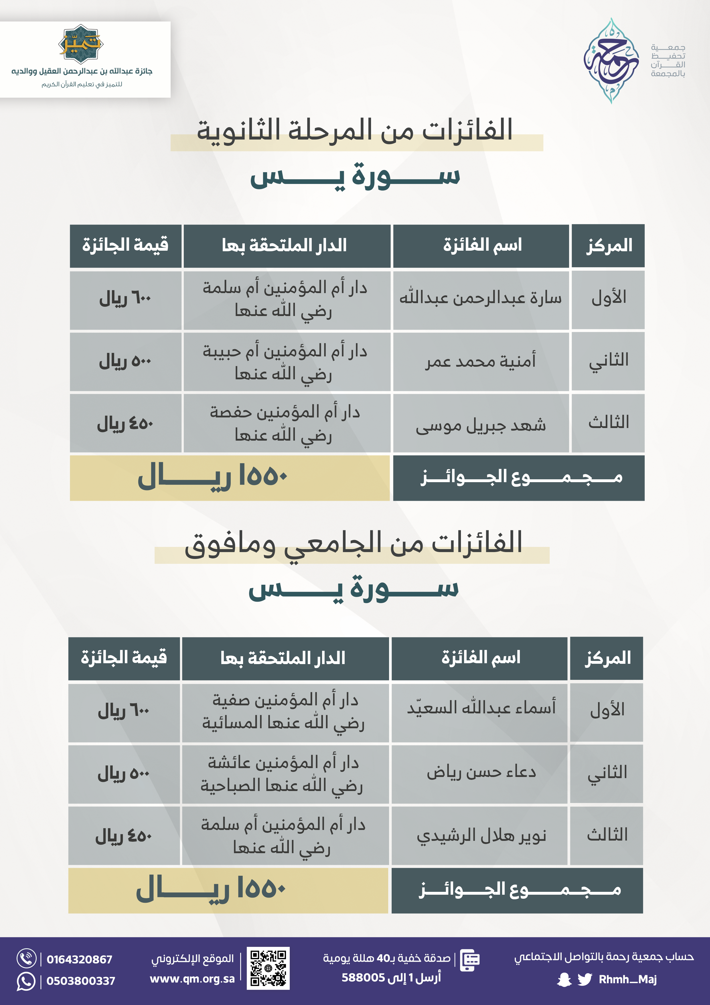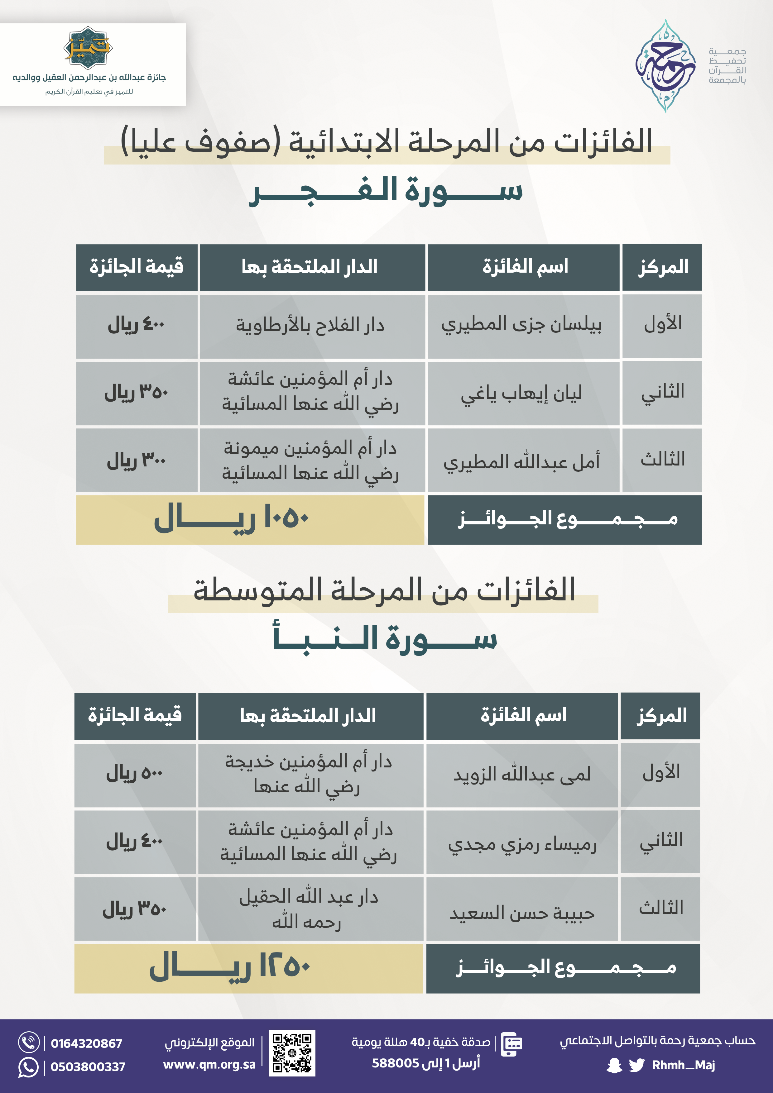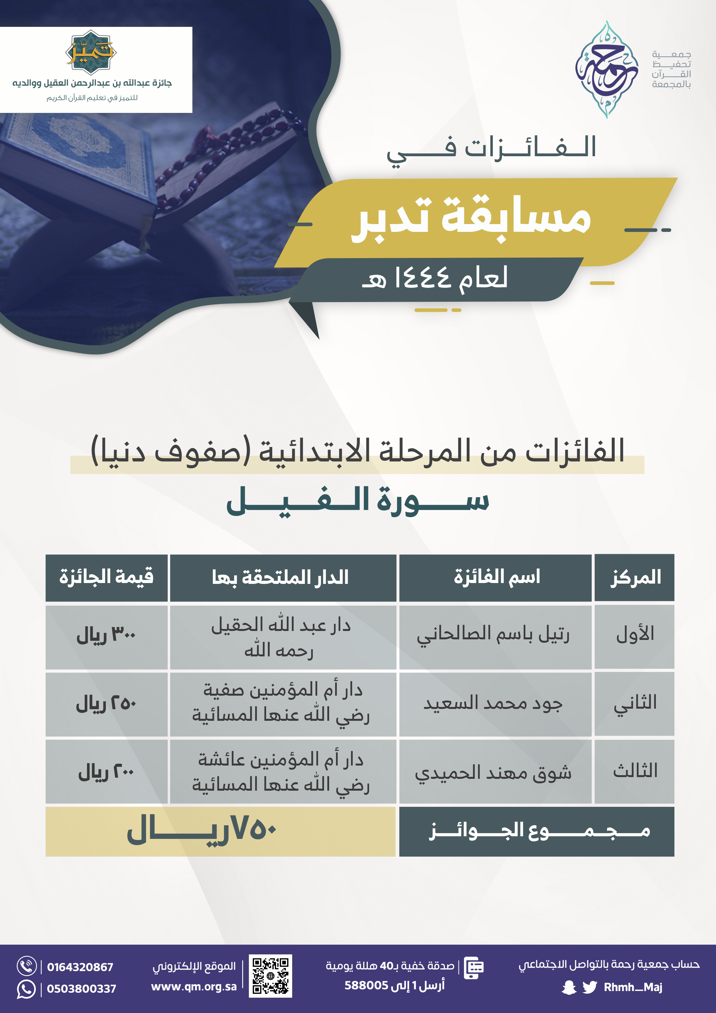 تعلن لجنة جائزة الشيخ عبدالله العقيل ووالديه للتميز في تعليم القرآن الكريم -بنات- عن أسماء الفائزات في مسابقة تدبر لعام 1444ه، علماً أنه حصلت 50 دارسة على الدرجة النهائية ووفقاً لنظام الجائزة فقد تم الاقتراع على المراكز الثلاث الأولى وسيتم تكريم بقية المشاركات بشهادات ومكافآت تحفيزية.