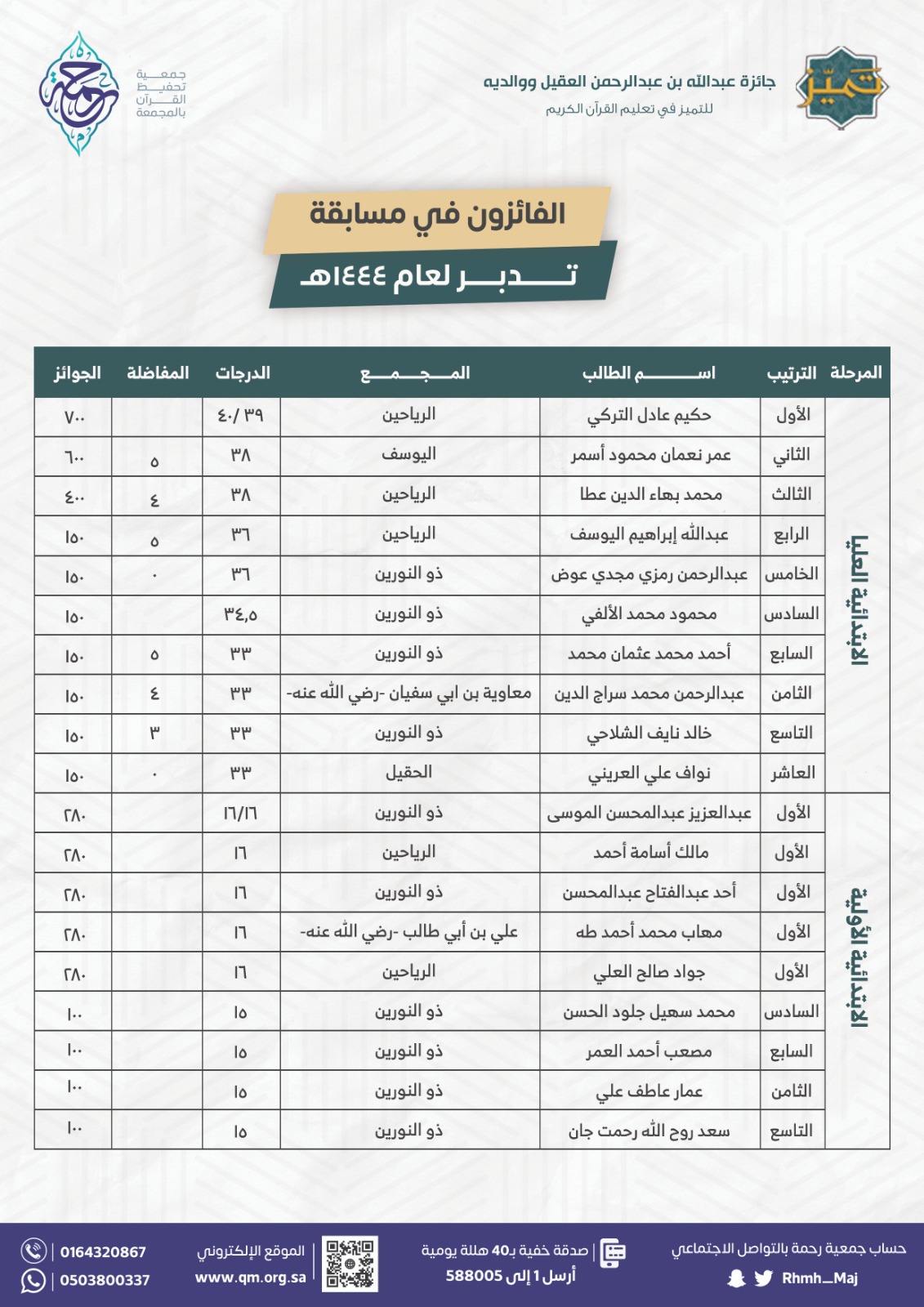 تعلن اللجنة التنفيذية لجائزة التميز -بنين- عن نتائج الفائزين في مسابقة تدبر لهذا العام ١٤٤٤هـ