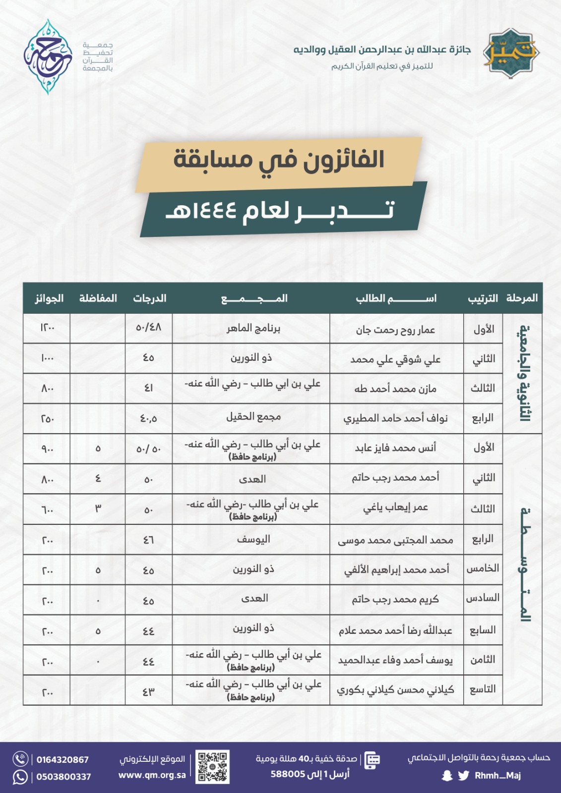 أسماء الفائزين بمسابقة تدبر لهذا العام 1444هـ